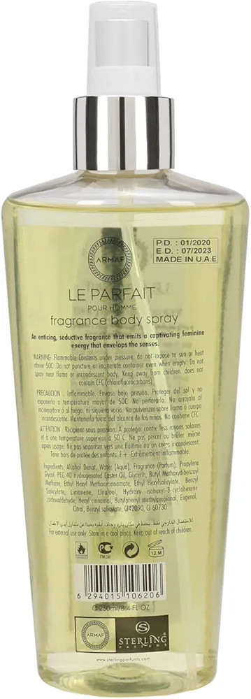 Ingredients alcohol DENAT, PARFUM, AQUA, LIMONENE , BENZYL SALICYLATE, COUMARIN, LINALOOL, ALPHA ISOMETHYL IONONE, HYDROXYCITRONELLAL, BENZYL BENZOATE, CITRAL, EUGENOL, 80 % VOLUME