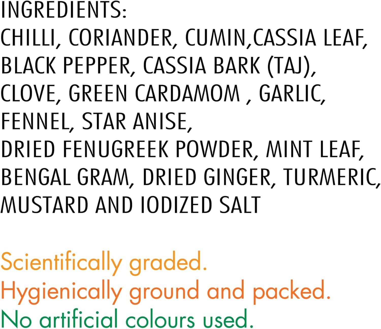 ingredients:Chilli, cumin, black pepper, coriander, cassia, clove, cardamom, garlic, fennel seed, anistar, dry fenugreek, mint leaf, dry ginger, turmeric, bengal gram