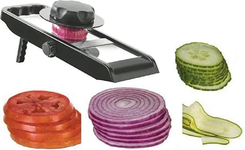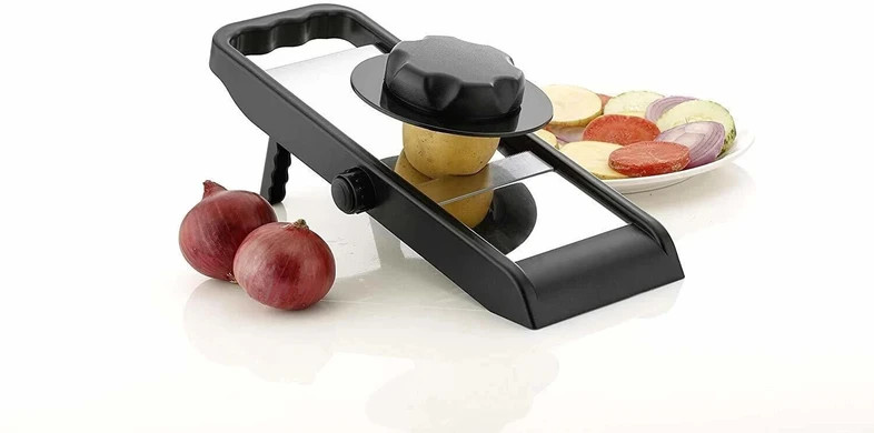 Comes with a secure hand guard to hold the vegetable while slicing, protecting your fingers from the sharp blades., The slicer includes a non-slip base and angled stand to keep it stable on countertops during use., A built-in knob allows you to adjust slicing thickness without touching the blade, ensuring safe handling., Ergonomically designed handle offers firm control and reduces the risk of slipping while slicing., The slicing area is partially enclosed, minimizing direct exposure to the blade during operation.
